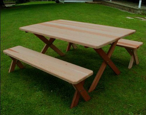 This cross-legged picnic table has the rustic and classic appeal of cross legs and a traditional shape, but adds class with detached benches, rich red cedar, and a nice smooth finish.