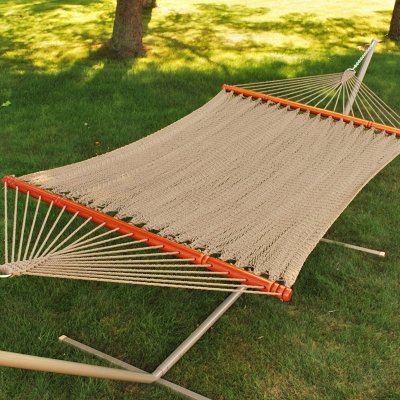 Made for two, polyester tight weave rope hammock is the perfect place to spend a restful afternoon. It's not only attractive it's also strong and comfortable. It's the perfect place to enjoy a quiet afternoon. Made in the USA. *Pillows and stand are sold separately.